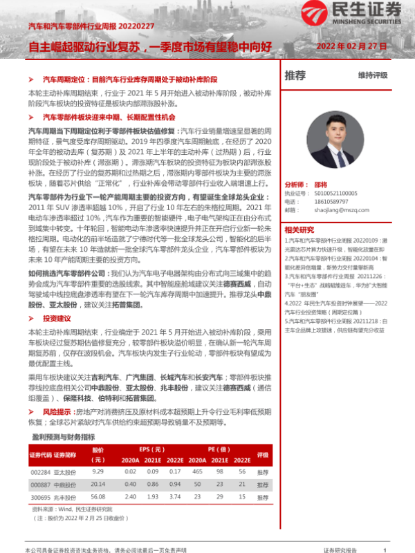 【民生证券】【20220227】汽车和汽车零部件行业周报:自主崛起驱动行业复苏,一季度市场有望稳中向好-27页 行业研究