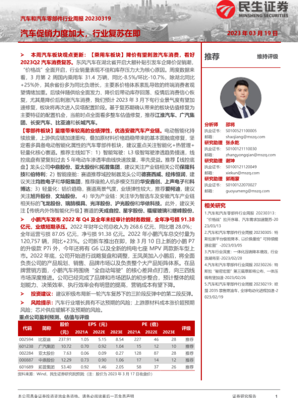 【民生证券】【20230319】汽车和汽车零部件行业周报:汽车促销力度加大,行业复苏在即-21页 行业研究