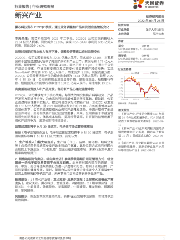 【天风证券】【20220925】新兴产业行业研究周报:雾芯科技发布2022Q2季报,通过业务调整和产品研发适应监管新变化-4页 行业研究