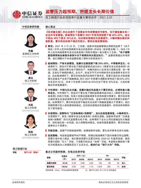 【中信证券】【20210323】轻工制造行业新型烟草行业重大事项点评:监管压力超预期,把握龙头长期价值-3页 行业研究