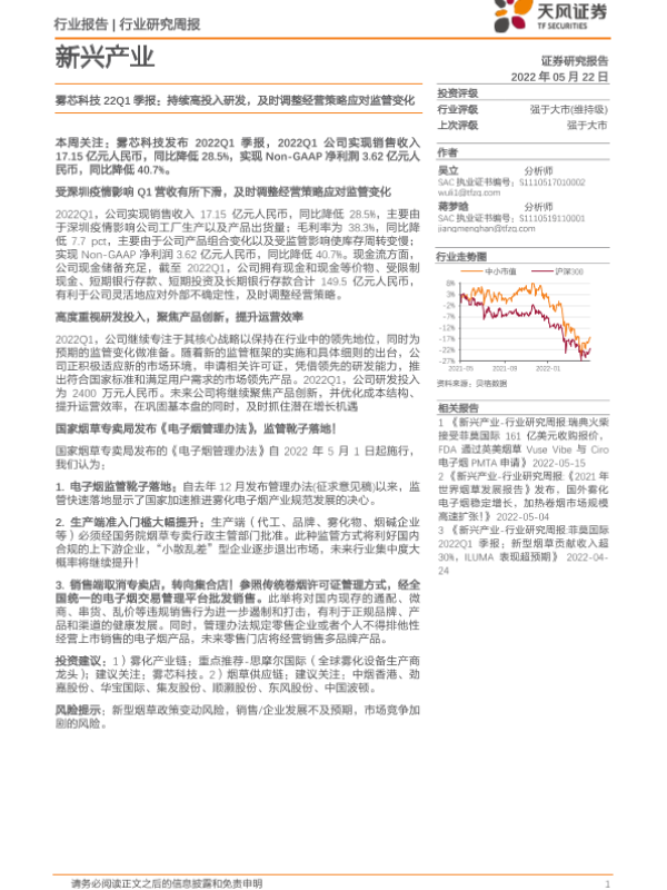 【天风证券】【20220522】新兴产业行业研究周报:雾芯科技22Q1季报:持续高投入研发,及时调整经营策略应对监管变化-4页 行业研究