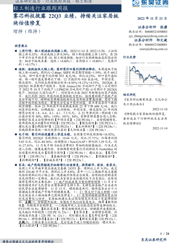 【东吴证券】【20221121】轻工制造行业跟踪周报:雾芯科技披露22Q3业绩,持续关注家居板块估值修复-24页 行业研究
