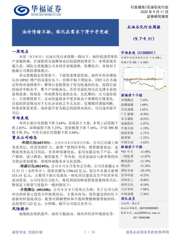 【华福证券】【20200911】石油石化行业周报:油价情绪不振,炼化在需求下滑中寻突破-10页 行业研究