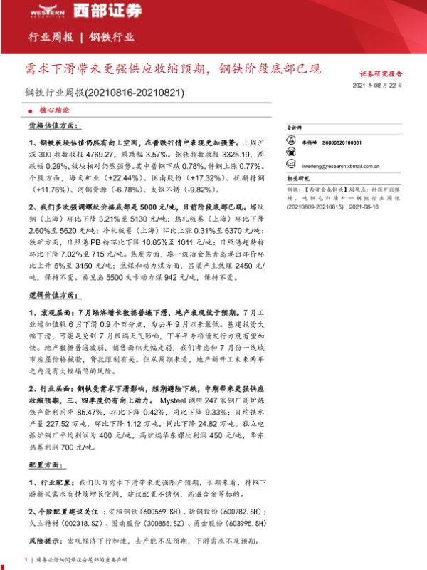 【西部证券】【20210822】20210822-西部证券-钢铁行业周报:需求下滑带来更强供应收缩预期,钢铁阶段底部已现-12页 行业研究