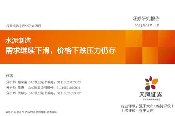 【天风证券】【20210614】水泥制造行业:需求继续下滑,价格下跌压力仍存-19页 行业研究