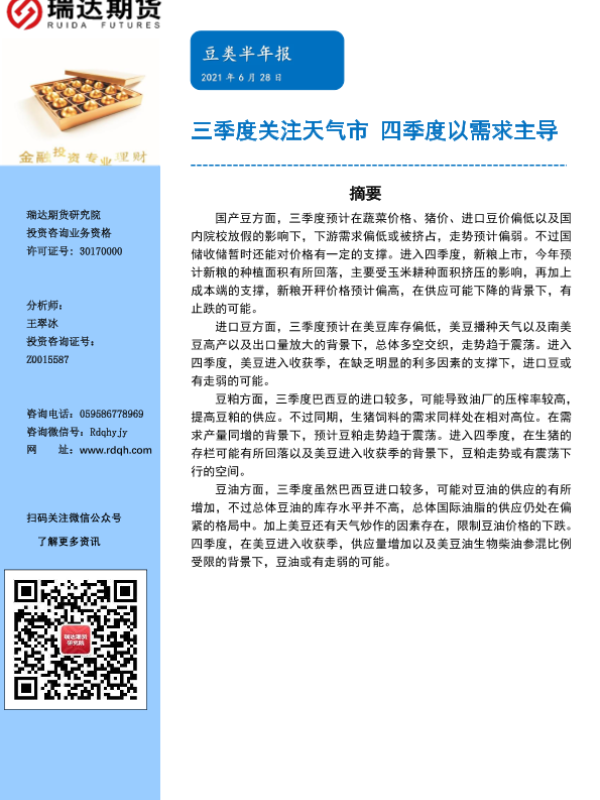 【瑞达期货】【20210628】豆类半年报:三季度关注天气市,四季度以需求主导-26页 行业研究