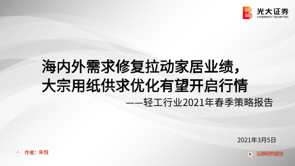 【光大证券】【20210305】轻工行业2021年春季策略报告:海内外需求修复拉动家居业绩,大宗用纸供求优化有望开启行情-13页 行业研究