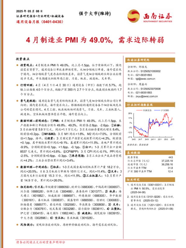 【西南证券】【20250508】机械设备行业通用设备月报:4月制造业PMI为49.0%,需求边际转弱-13页 行业研究