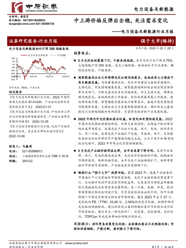 【中原证券】【20230228】电力设备及新能源行业月报:中上游价格反弹后企稳,关注需求变化-14页 行业研究