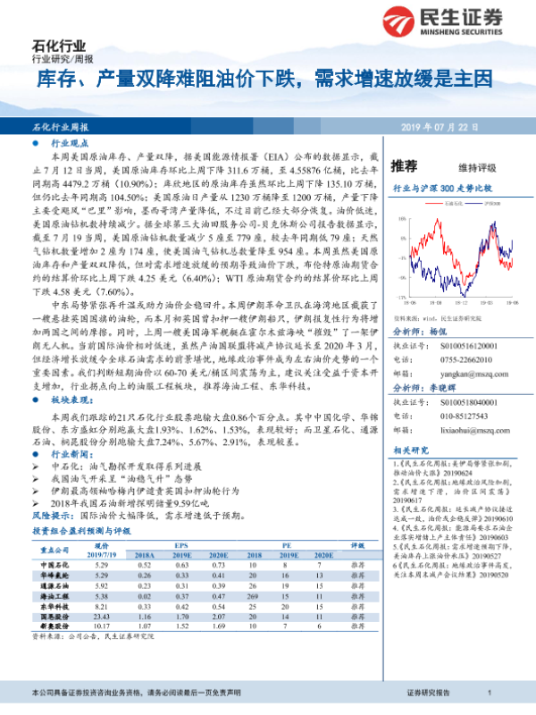 【民生证券】【20190722】石化行业周报:库存、产量双降难阻油价下跌,需求增速放缓是主因-16页 行业研究