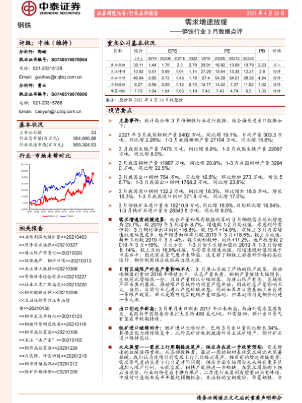 【中泰证券】【20210416】钢铁行业3月数据点评:需求增速放缓-5页 行业研究