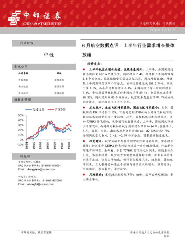 【中邮证券】【20190716】6月航空数据点评:上半年行业需求增长整体放缓-10页 行业研究