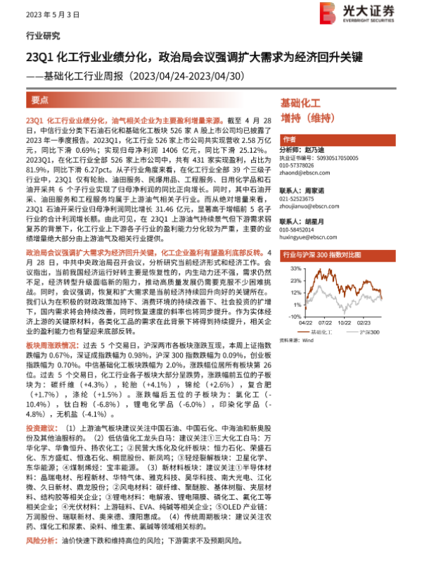 【光大证券】【20230503】23Q1化工行业业绩分化,政治局会议强调扩大需求为经济回升关键-42页 行业研究