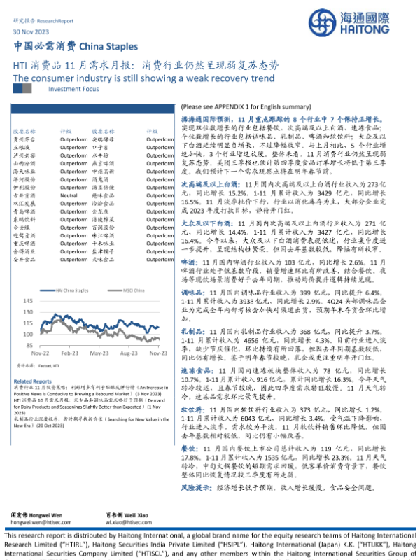 【海通国际】【20231130】HTI消费品11月需求月报:消费行业仍然呈现弱复苏态势-14页 行业研究