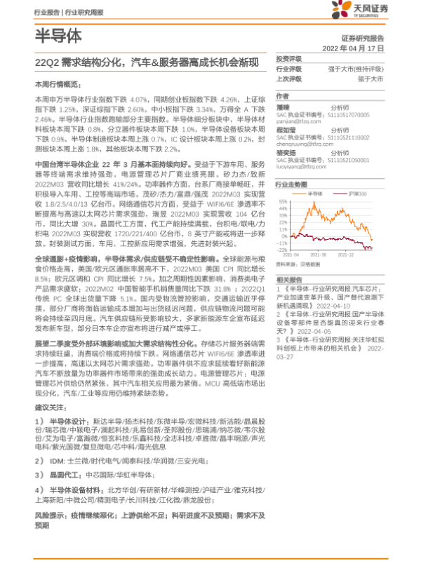 【天风证券】【20220417】20220417-天风证券-半导体行业研究周报:22Q2需求结构分化,汽车&服务器高成长机会渐现-16页 行业研究
