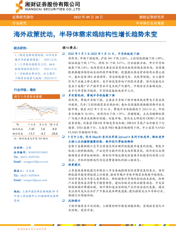 【湘财证券】【20220922】半导体行业双周报:海外政策扰动,半导体需求端结构性增长趋势未变-11页 行业研究