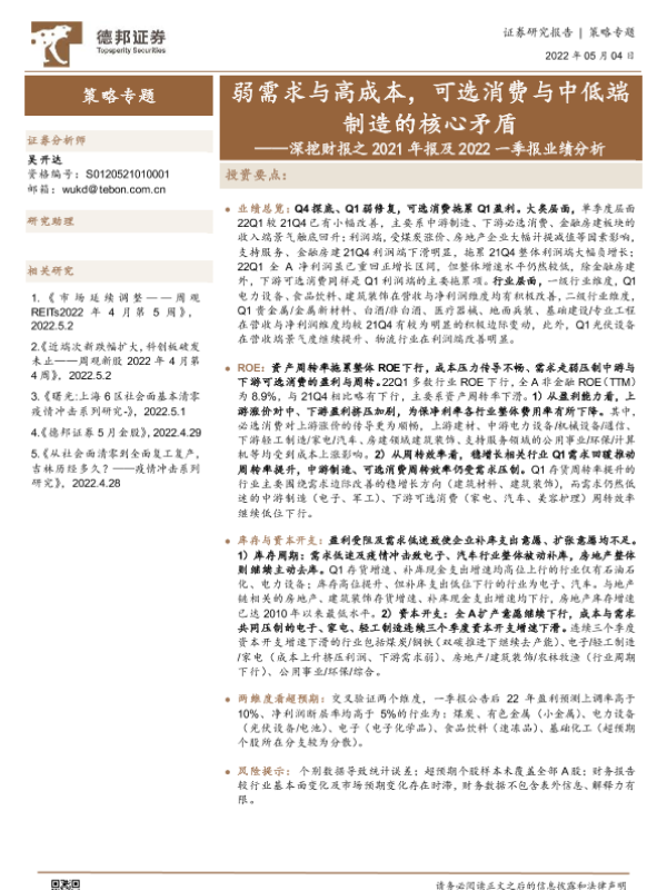 【德邦证券】【20220504】深挖财报之2021年报及2022一季报业绩分析:弱需求与高成本,可选消费与中低端制造的核心矛盾-25页 行业研究
