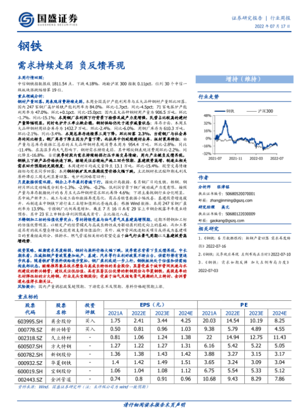 【国盛证券】【20220717】20220717-国盛证券-钢铁行业周报:需求持续走弱 负反馈再现-17页 行业研究