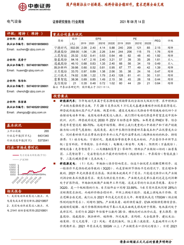 【中泰证券】【20210814】20210814-中泰证券-电气设备行业周报:国产特斯拉出口创新高、硅料价格企稳回升,需求逻辑全面兑现-23页 行业研究