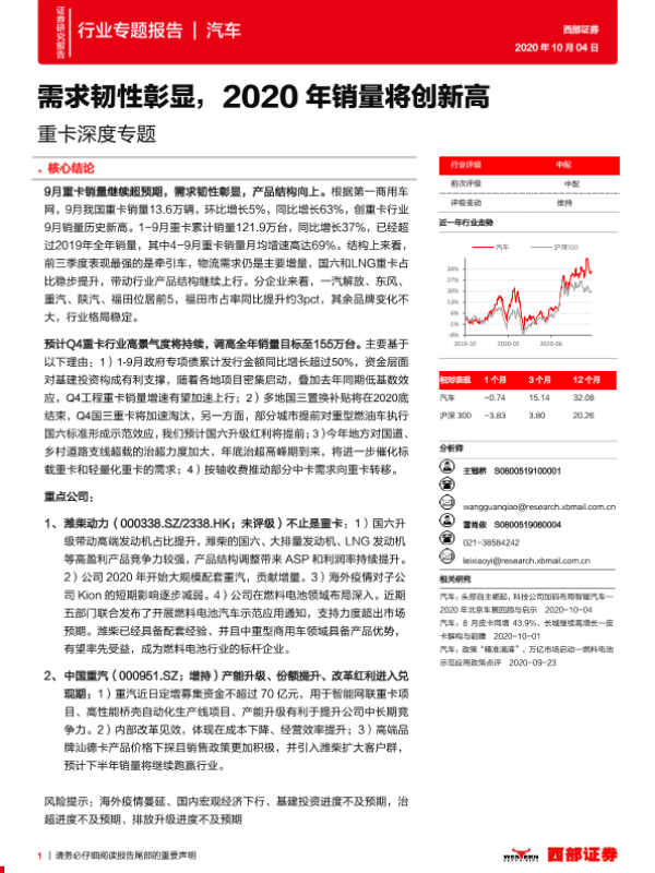 【西部证券】【20201004】重卡深度专题:需求韧性彰显,2020年销量将创新高-15页 行业研究