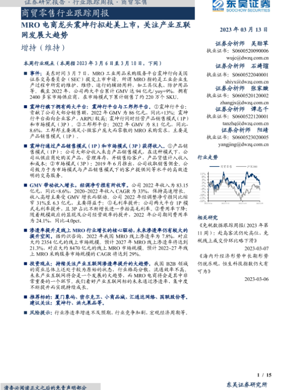 【东吴证券】【20230313】商贸零售行业跟踪周报:MRO电商龙头震坤行拟赴美上市,关注产业互联网发展大趋势-15页 行业研究