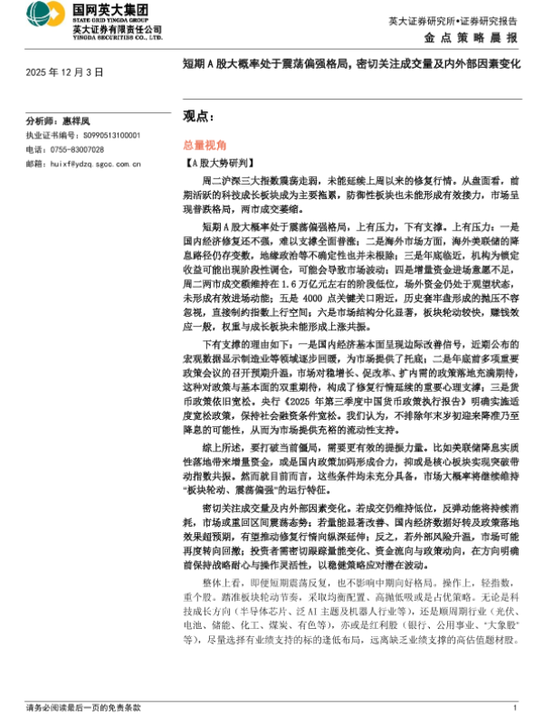 【英大证券】【202512】金点策略晨报:短期A股大概率处于震荡偏强格局,密切关注成交量及内外部因素变化-5页 证券期货研究报告