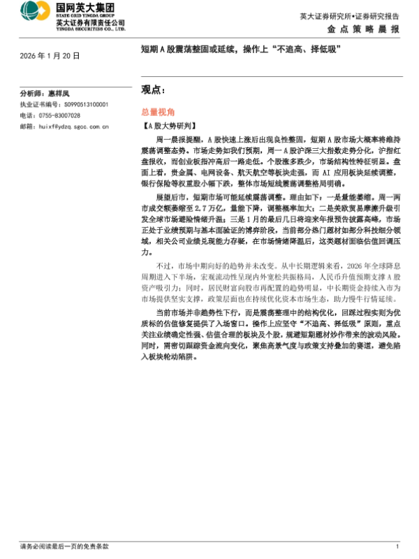 【YINGDA SECURITIES CO.<D.】【202601】2026-01-20_英大证券_金点策略晨报:短期A股震荡整固或延续,操作上“不追高、择低吸”-4页 证券期货研究报告