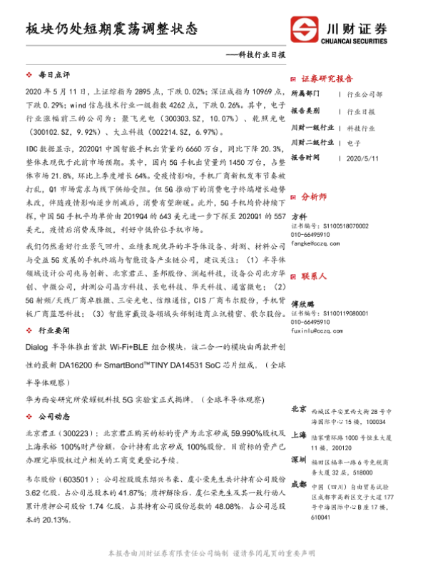 【川财证券】【20200511】科技行业日报:板块仍处短期震荡调整状态-4页 证券期货研究报告