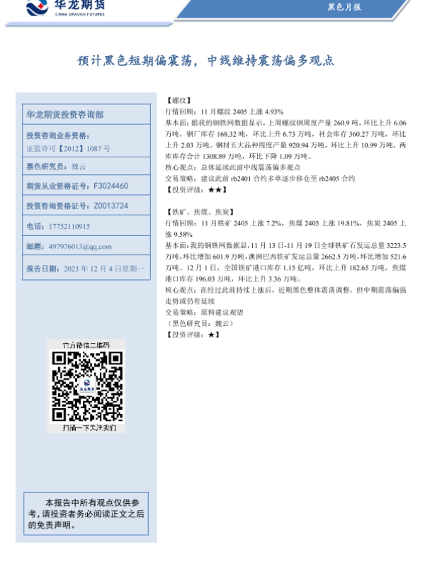 【华龙期货】【20231204】黑色月报:预计黑色短期偏震荡,中线维持震荡偏多观点-13页 行业研究