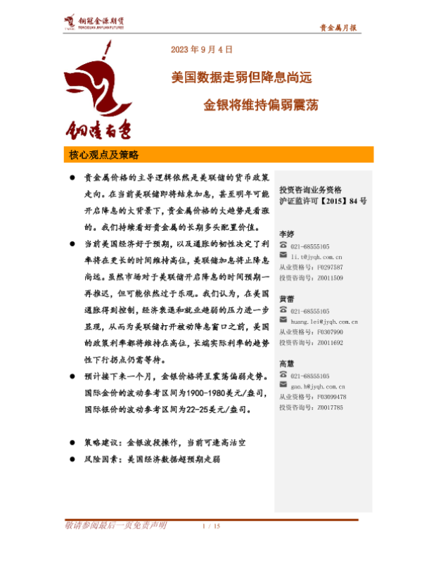 【铜冠金源期货】【20230904】贵金属月报:美国数据走弱但降息尚远,金银将维持偏弱震荡-15页 行业研究