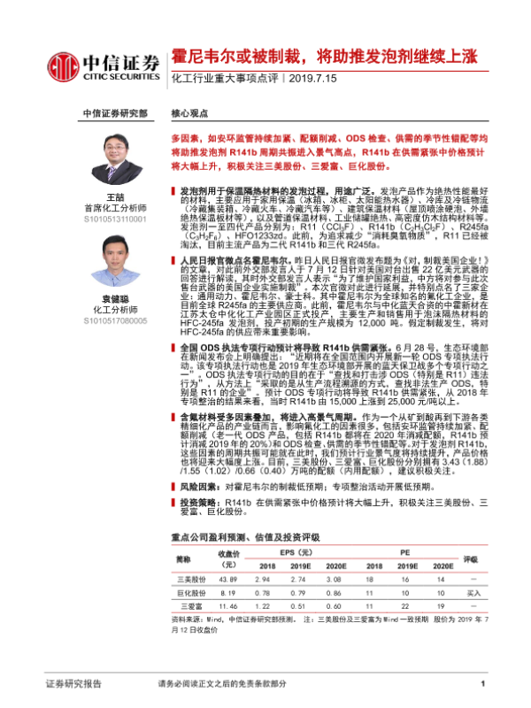 【中信证券】【20190715】化工行业重大事项点评:霍尼韦尔或被制裁,将助推发泡剂继续上涨-2页 行业研究