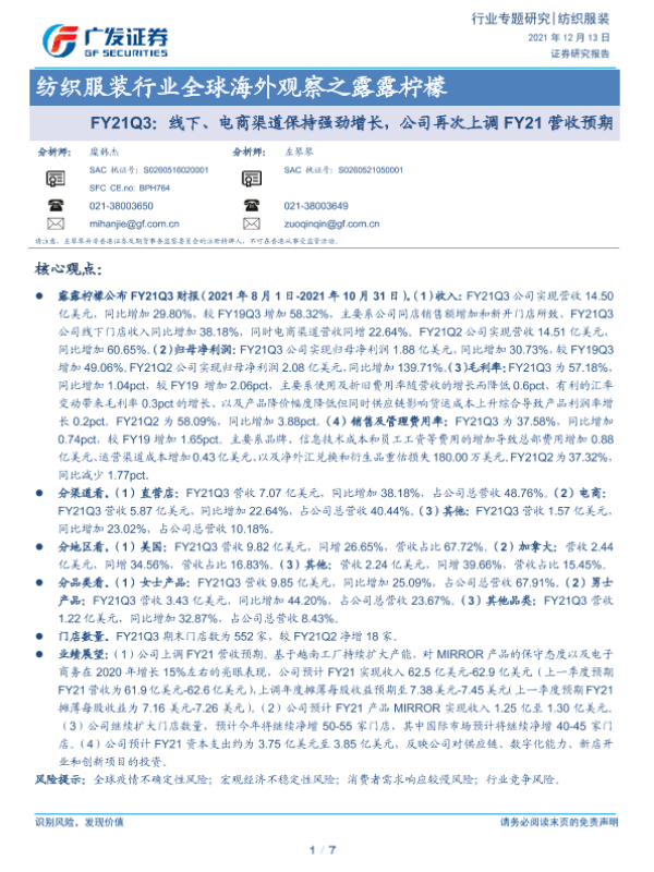 【广发证券】【20210914】纺织服装行业全球观察之露露柠檬:FY21Q2:线下门店营收同增142%,公司上调FY21营收预期-7页 行业研究