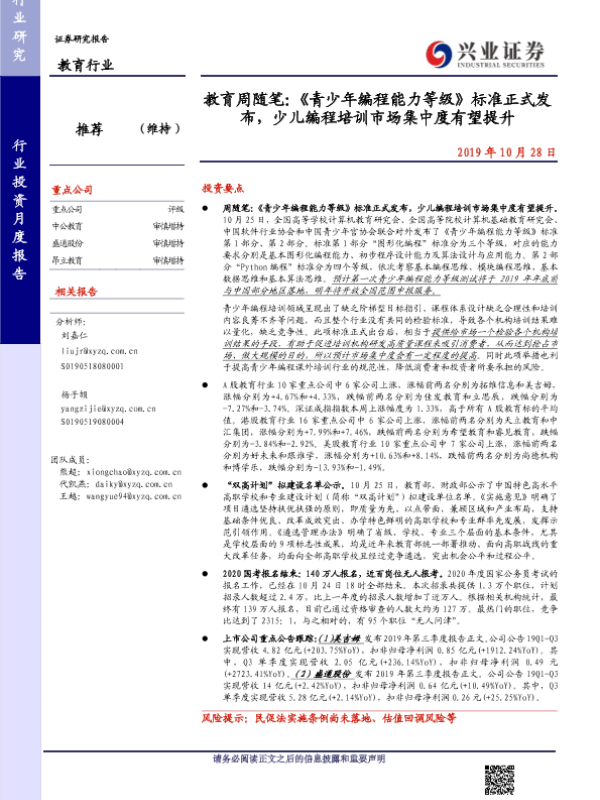 【兴业证券】【20191028】教育周随笔:《青少年编程能力等级》标准正式发布,少儿编程培训市场集中度有望提升-13页 行业研究