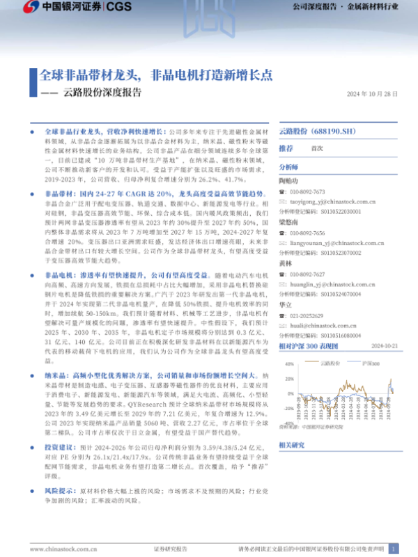 【银河证券】【20241028】云路股份(688190)深度报告:全球非晶带材龙头,非晶电机打造新增长点-35页 行业研究