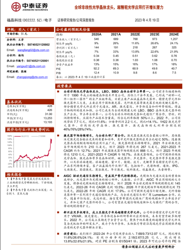 【中泰证券】【20230419】福晶科技(002222)全球非线性光学晶体龙头,超精密光学应用打开增长潜力-28页 公司研究