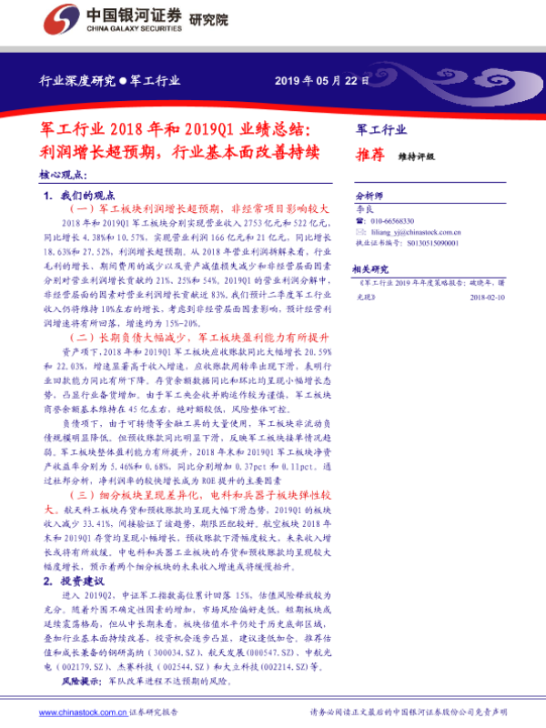 【银河证券】【20190522】军工行业2018年和2019Q1业绩总结:利润增长超预期,行业基本面改善持续-8页 行业研究