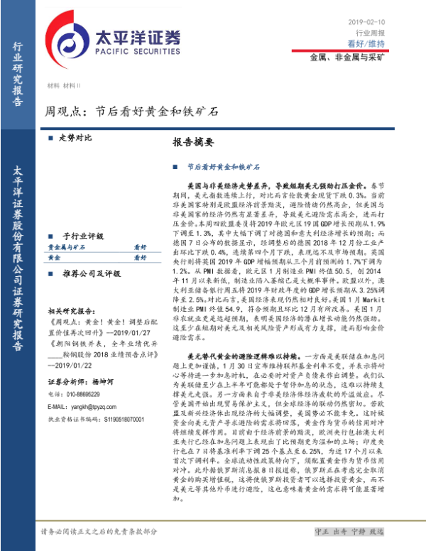 【太平洋证券】【20190210】20190210-太平洋-金属、非金属与采矿周观点:节后看好黄金和铁矿石-4页 行业研究