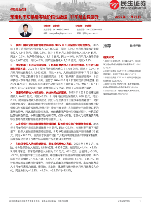 【民生证券】【202511】保险行业点评:预定利率切换后寿险阶段性放缓,非车险企稳回升-6页 证券期货研究报告