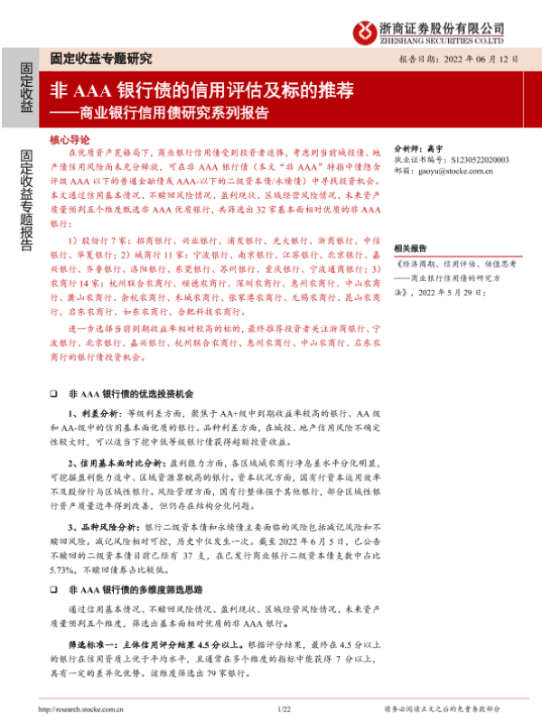 【浙商证券】【20220612】非AAA银行债的信用评估及标的推荐-22页 行业研究