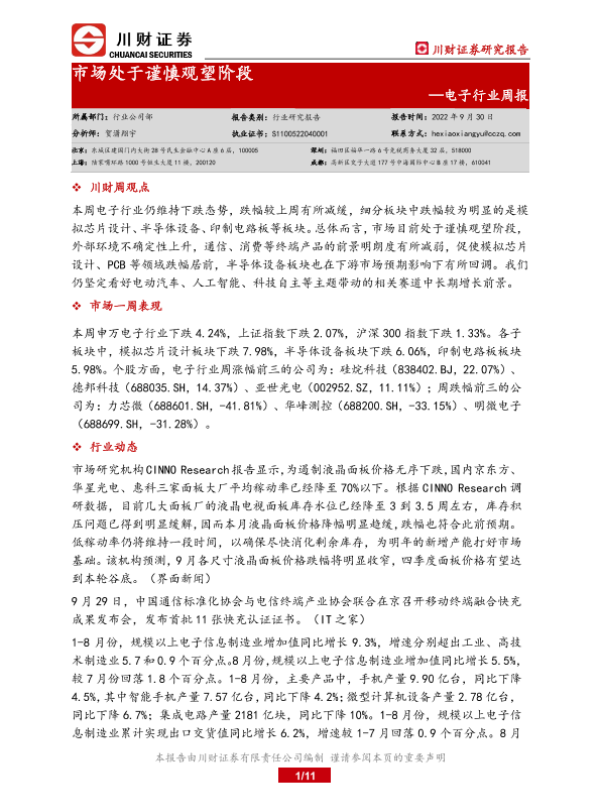 【川财证券】【20220930】20220930-川财证券-电子行业周报:市场处于谨慎观望阶段-11页 行业研究