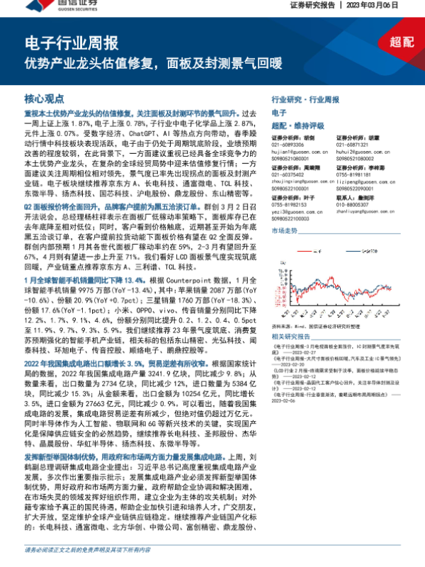 【国信证券】【20230306】电子行业周报:优势产业龙头估值修复,面板及封测景气回暖-13页 行业研究