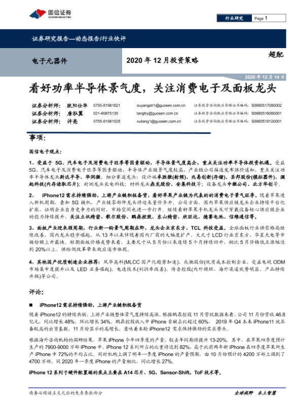 【国信证券】【20201214】电子元器件2020年12月投资策略:看好功率半导体景气度,关注消费电子及面板龙头-11页 行业研究