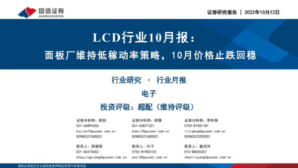 【国信证券】【20221012】LCD行业10月报:面板厂维持低稼动率策略,10月价格止跌回稳-24页 行业研究