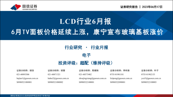 【国信证券】【20230617】LCD行业6月报:6月TV面板价格延续上涨,康宁宣布玻璃基板涨价-22页 行业研究