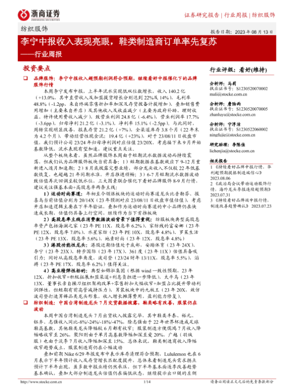 【浙商证券】【20230813】20230813-浙商证券-纺织服饰行业周报:李宁中报收入表现亮眼,鞋类制造商订单率先复苏-14页 行业研究