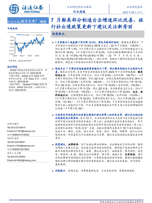 【海通证券】【20230813】20230813-海通证券-纺织与服装行业周报:7月鞋类部分制造台企增速环比改善,旅行社出境政策更新下建议关注新秀丽-11页 行业研究