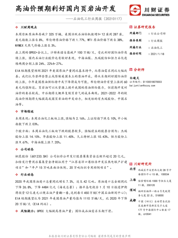 【川财证券】【20210118】20210118-川财证券-石油化工行业周报:高油价预期利好国内页岩油开发-11页 行业研究
