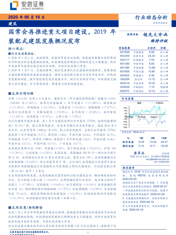 【安信证券】【20200510】建筑行业动态分析:国常会再推进重大项目建设,2019年装配式建筑发展概况发布-10页 行业研究