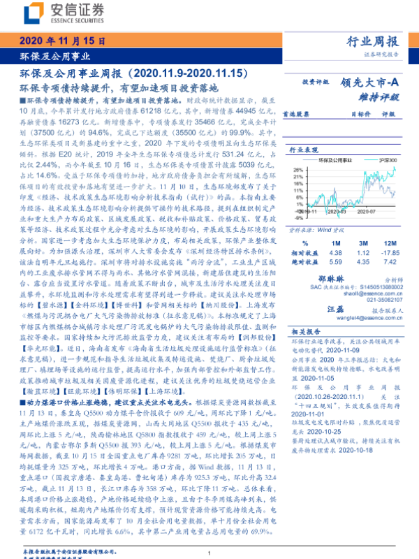 【安信证券】【20201115】环保及公用事业行业周报:环保专项债持续提升,有望加速项目投资落地-16页 行业研究