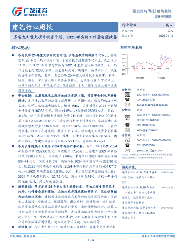 【广发证券】【20250112】建筑行业周报:多省发布重大项目投资计划,2025年实物工作量有望改善-14页 行业研究